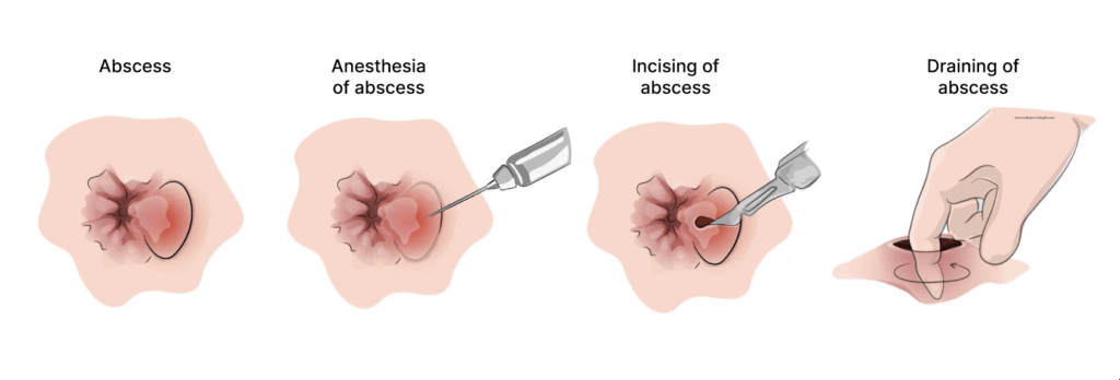 This is the standard, first-line approach for superficial abscesses and is often performed under local anaesthesia in a clinic or minor procedure setting. However, some cases may still require drainage in an operating room depending on the depth, location, or patient comfort.