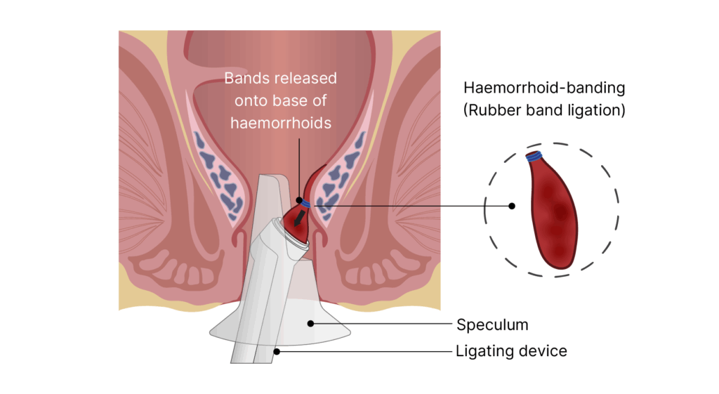 Rubber band ligation involves placing a tight rubber band around the base of the haemorrhoid to cut off its blood supply until it withers and falls off. Sclerotherapy involves injecting a chemical solution into the haemorrhoid to make it shrink in several sessions.