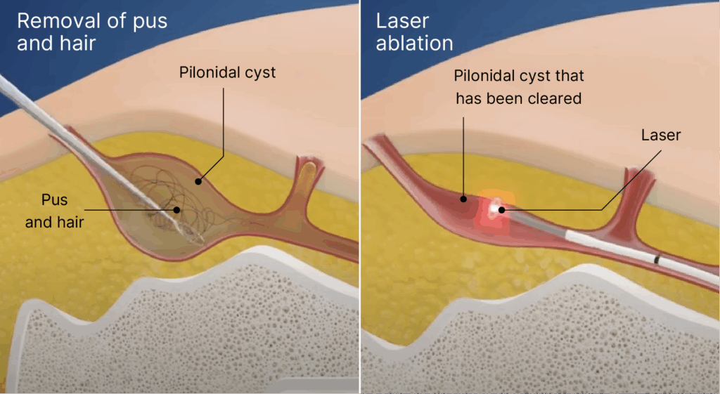• Pit Picking (Gips procedure): This uses a tiny incision to remove the small skin openings (“pits”) and any superficial sinus tracts.